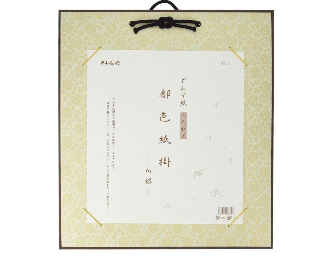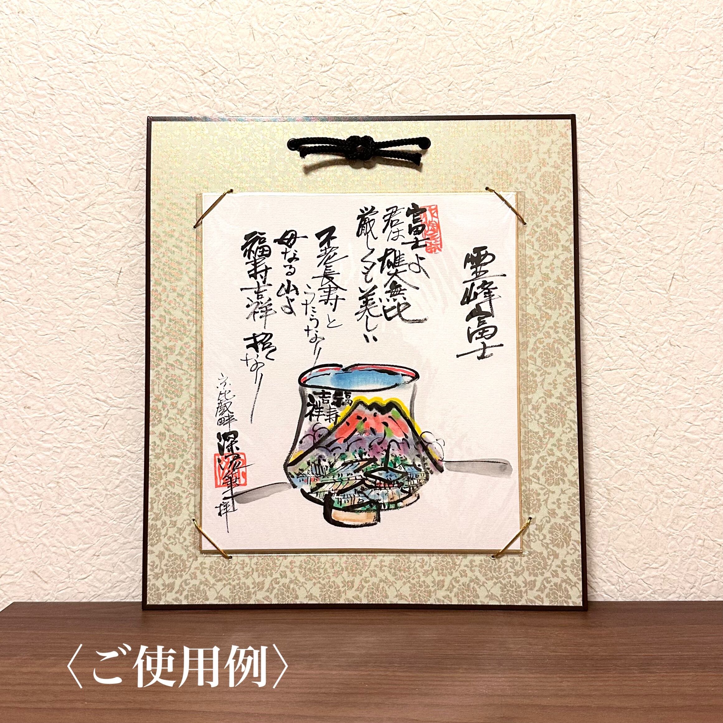 金刷りの美しい日本製緞子(どんす)紙を使用した色紙掛けは、作品を保護する透明カバー付き