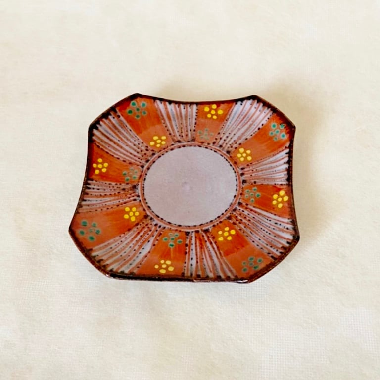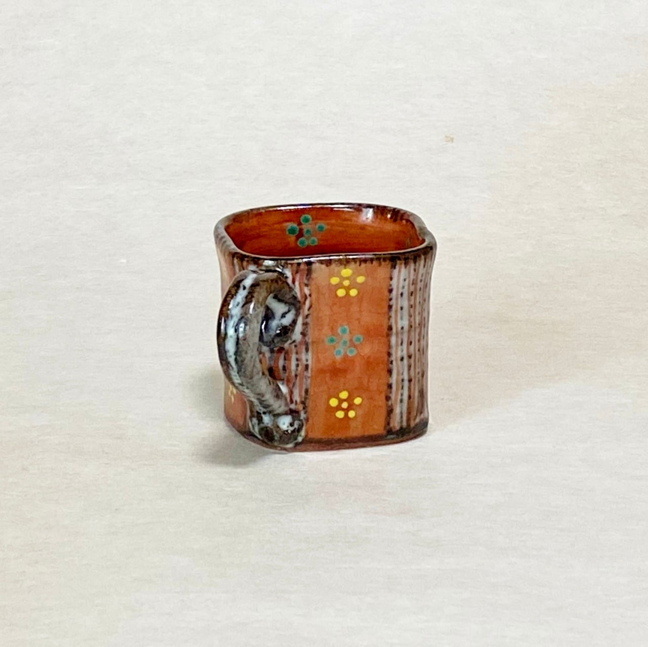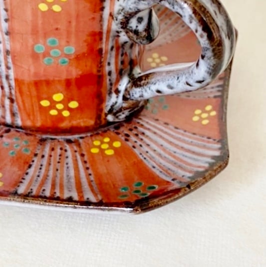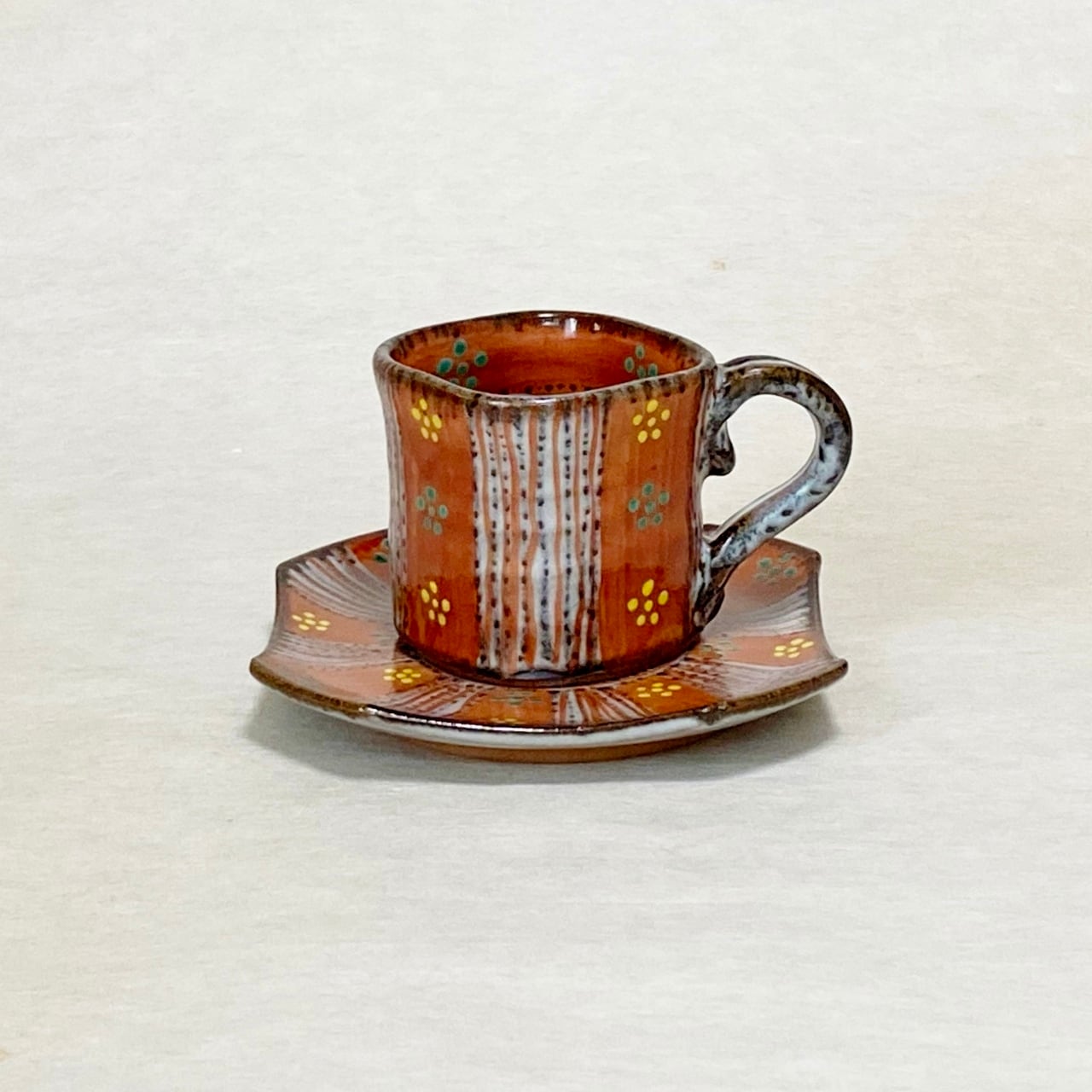 <赫三郎窯>赤絵 ト草梅鉢紋 角型コーヒー碗皿