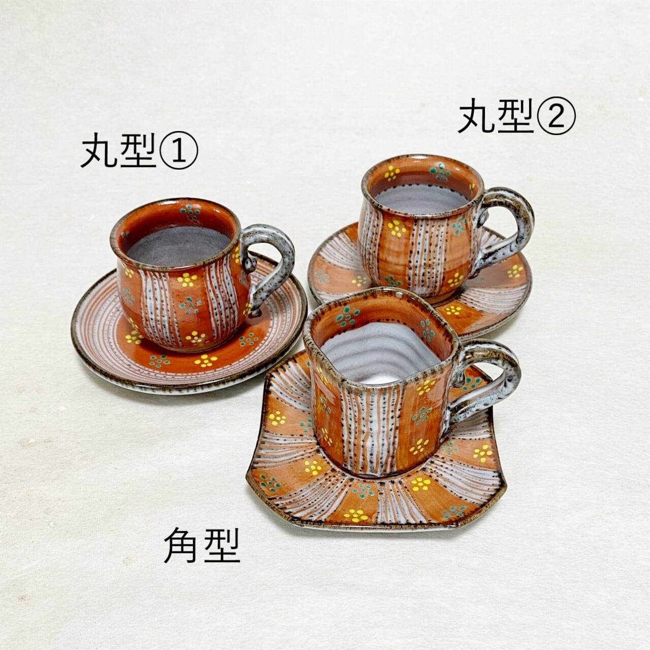 赤絵 ト草梅鉢紋のコーヒー碗皿は、デザイン違いで3種類ございます