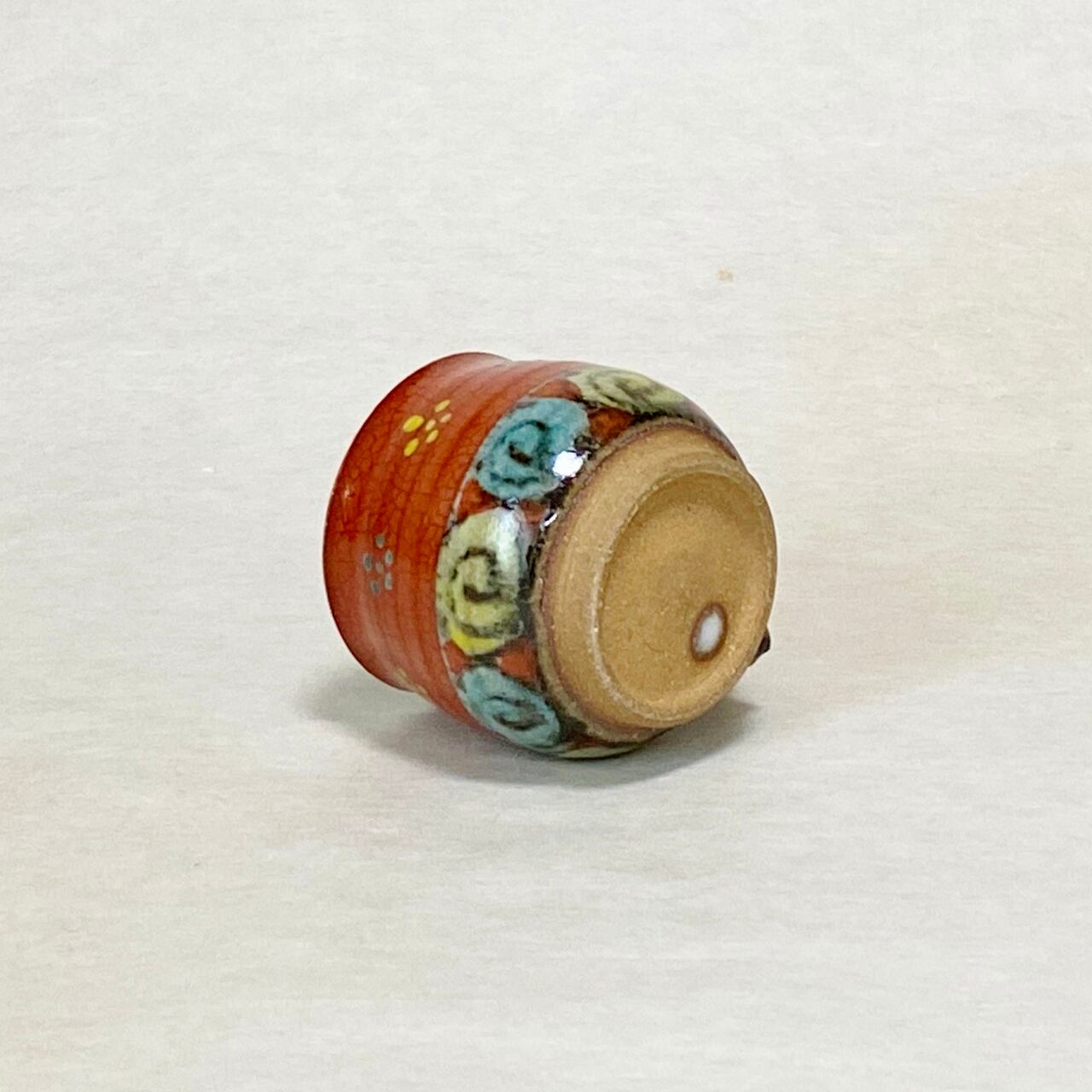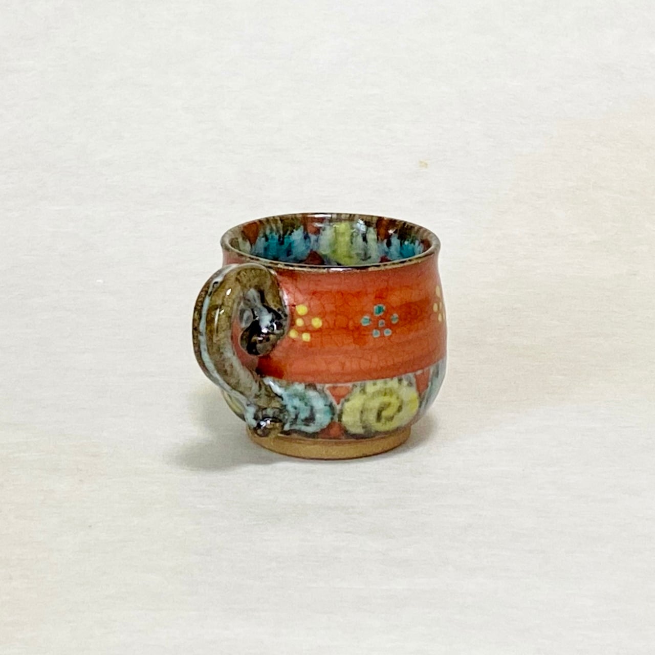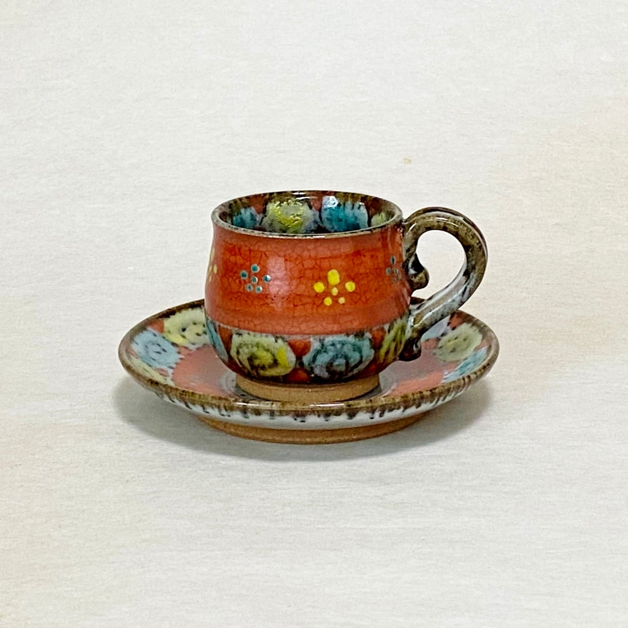 <赫三郎窯>赤絵 色渦梅鉢紋 丸型コーヒー碗皿