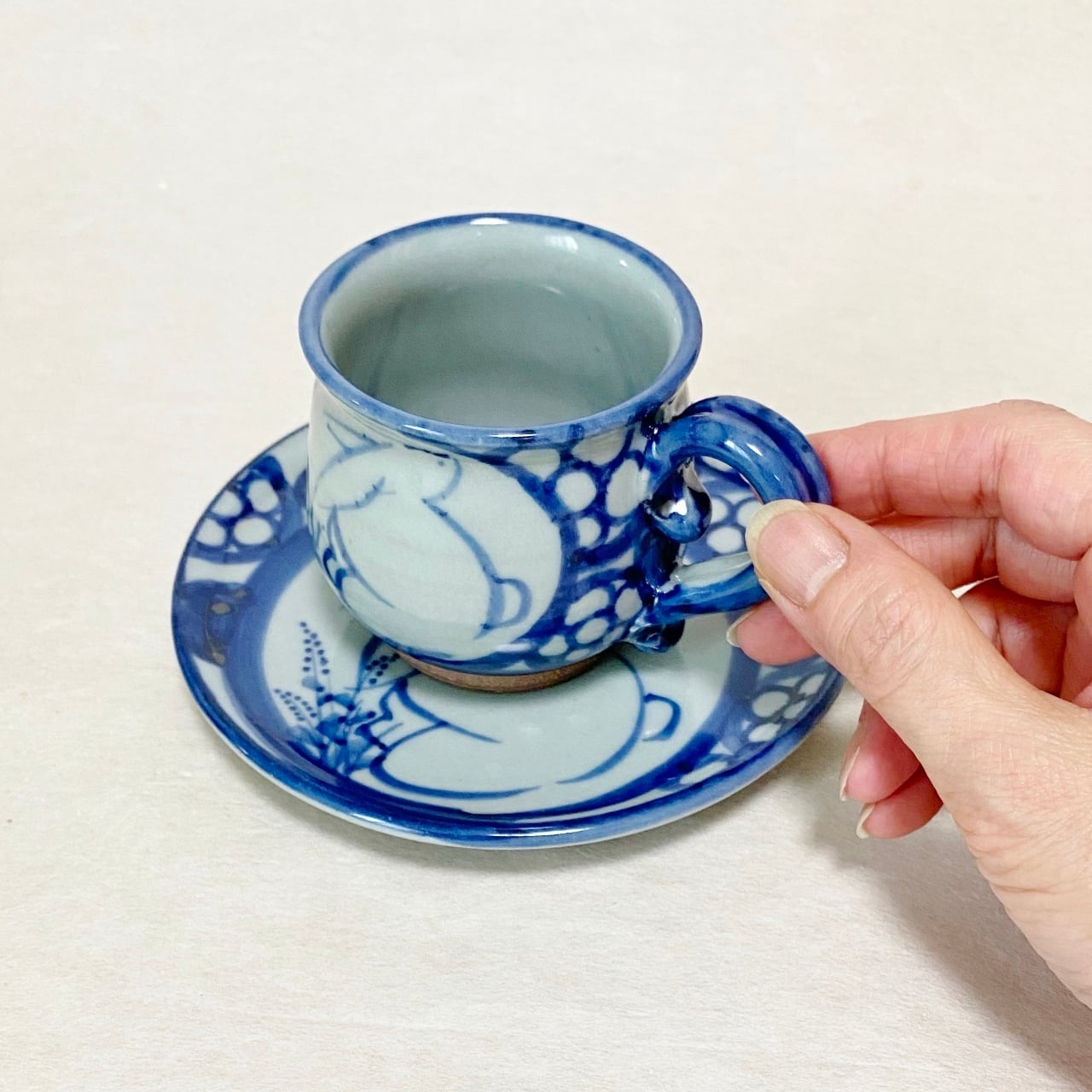シンプルな染付のコーヒー碗皿で、少し小ぶりサイズになっています 鮮やかな赫(赤)とは一転して優しいブルーの染付は、ゆったりくつろぎタイムにぴったりです 忙しさを忘れ、ホッコリしませんか?