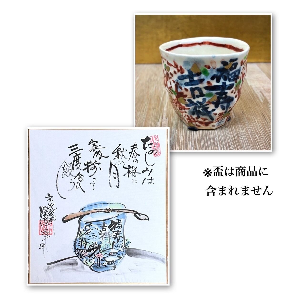 年を重ねたご主人が苦楽を共にした奥様と過ごすほのぼのとした日常を謳った詩が、色彩鮮やかな盃と一緒に描かれています