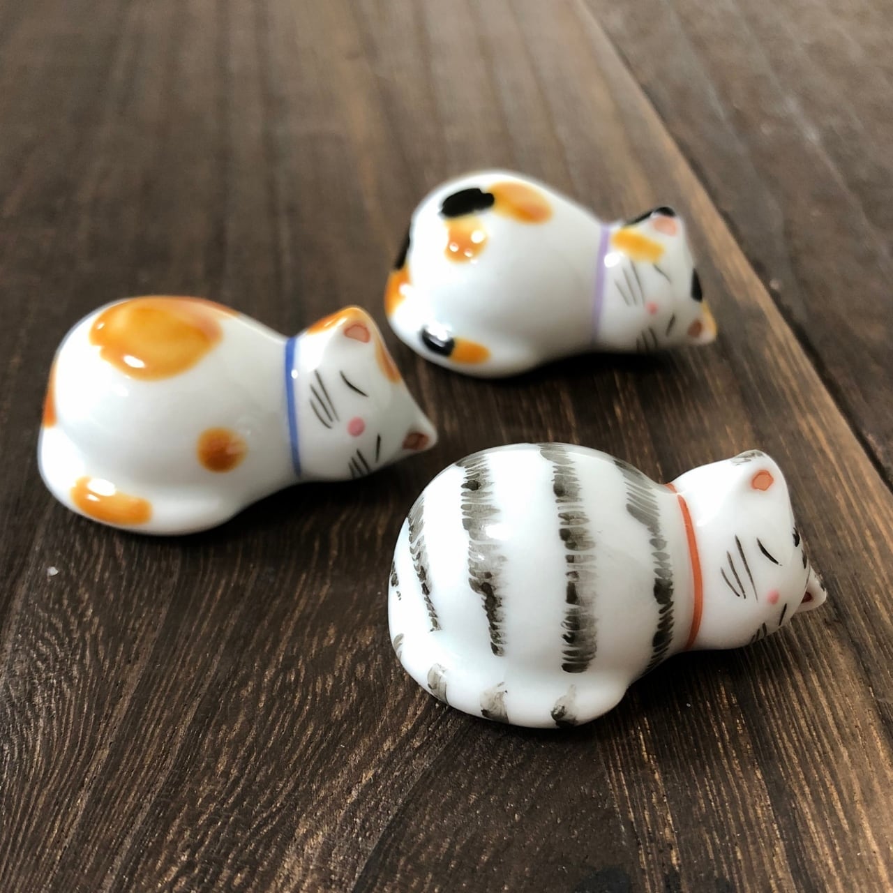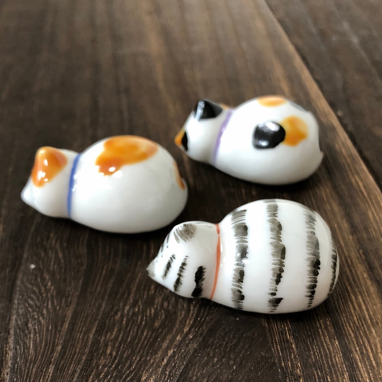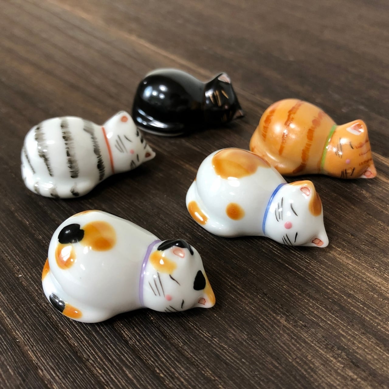 ポカポカしたひだまりの中で眠る猫の箸置です すやすやと気持ちよさそうですね♪ 愛くるしい表情と一つ一つの猫の模様が、手描きで丁寧に描かれています【紫泉】