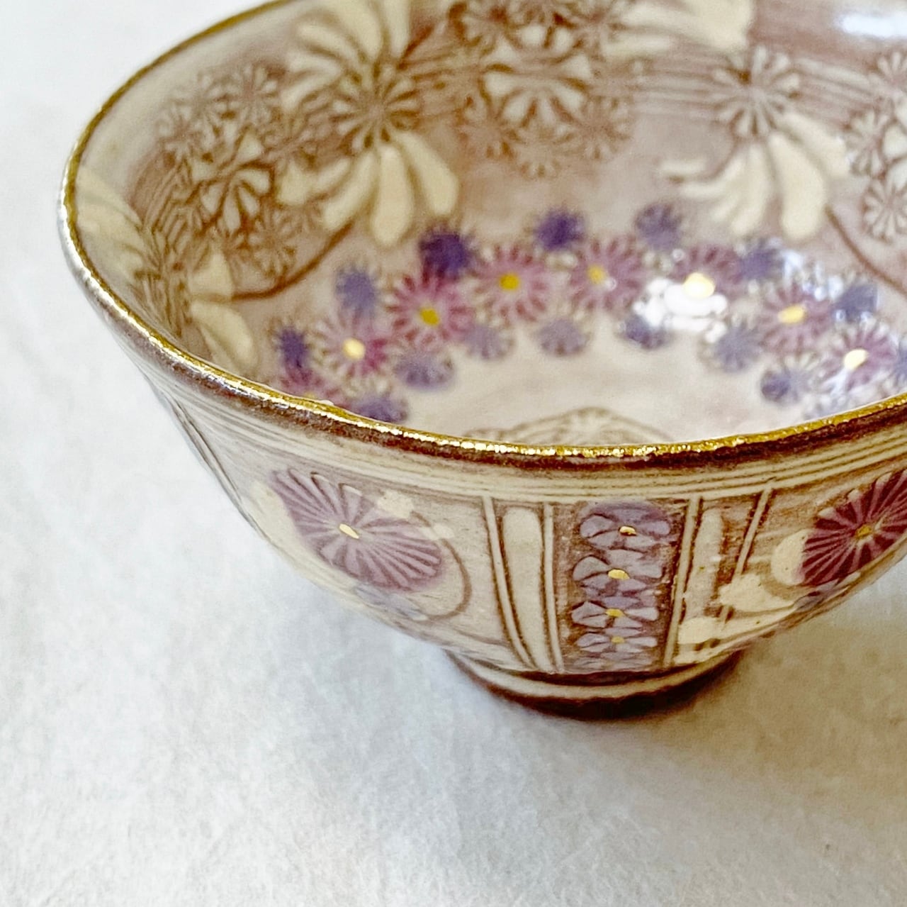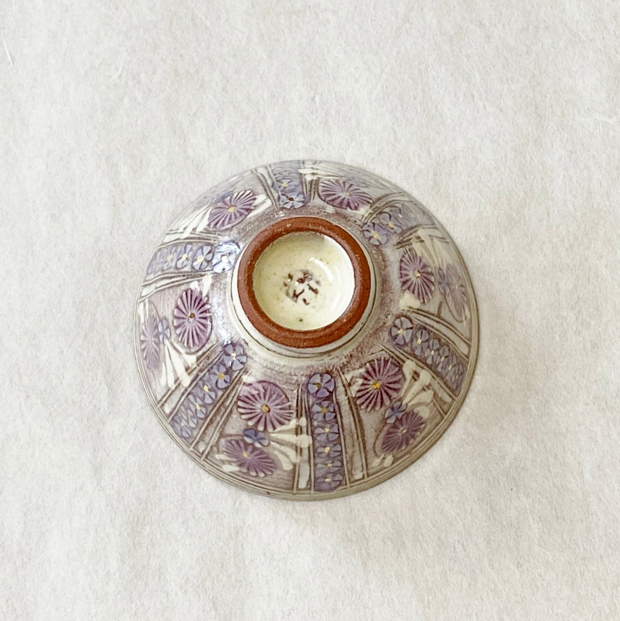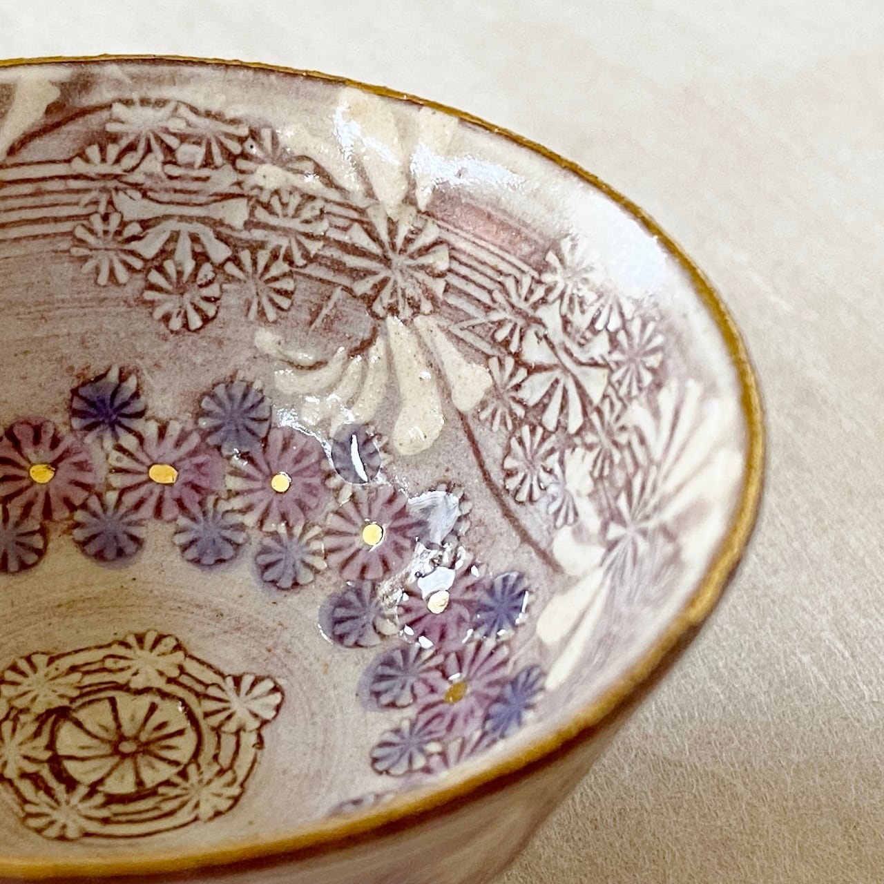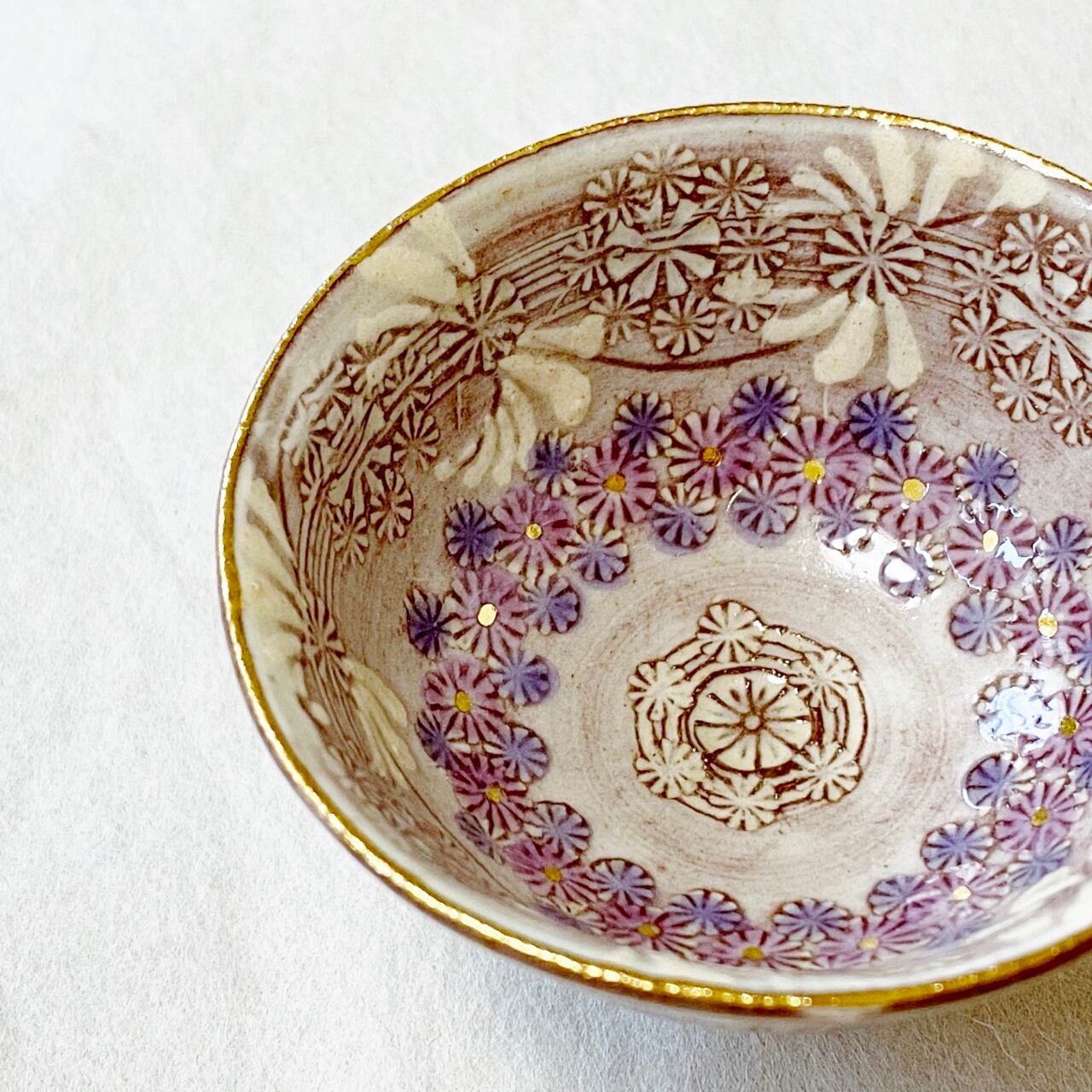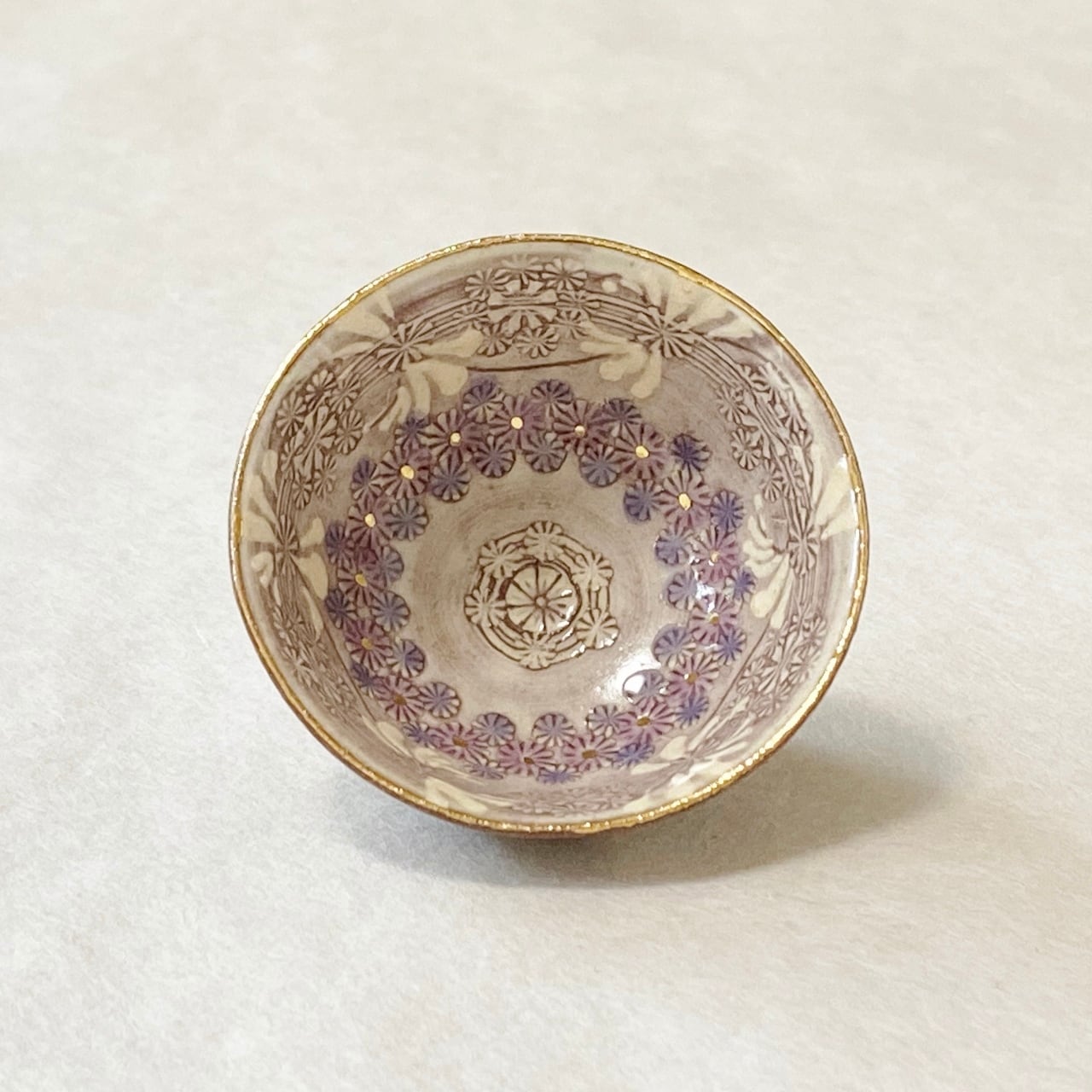 まるでレースのような紫彩花紋のシリーズ 内側にも紋様が施されているので、お酒を入れるとその美しさには惚れ惚れします