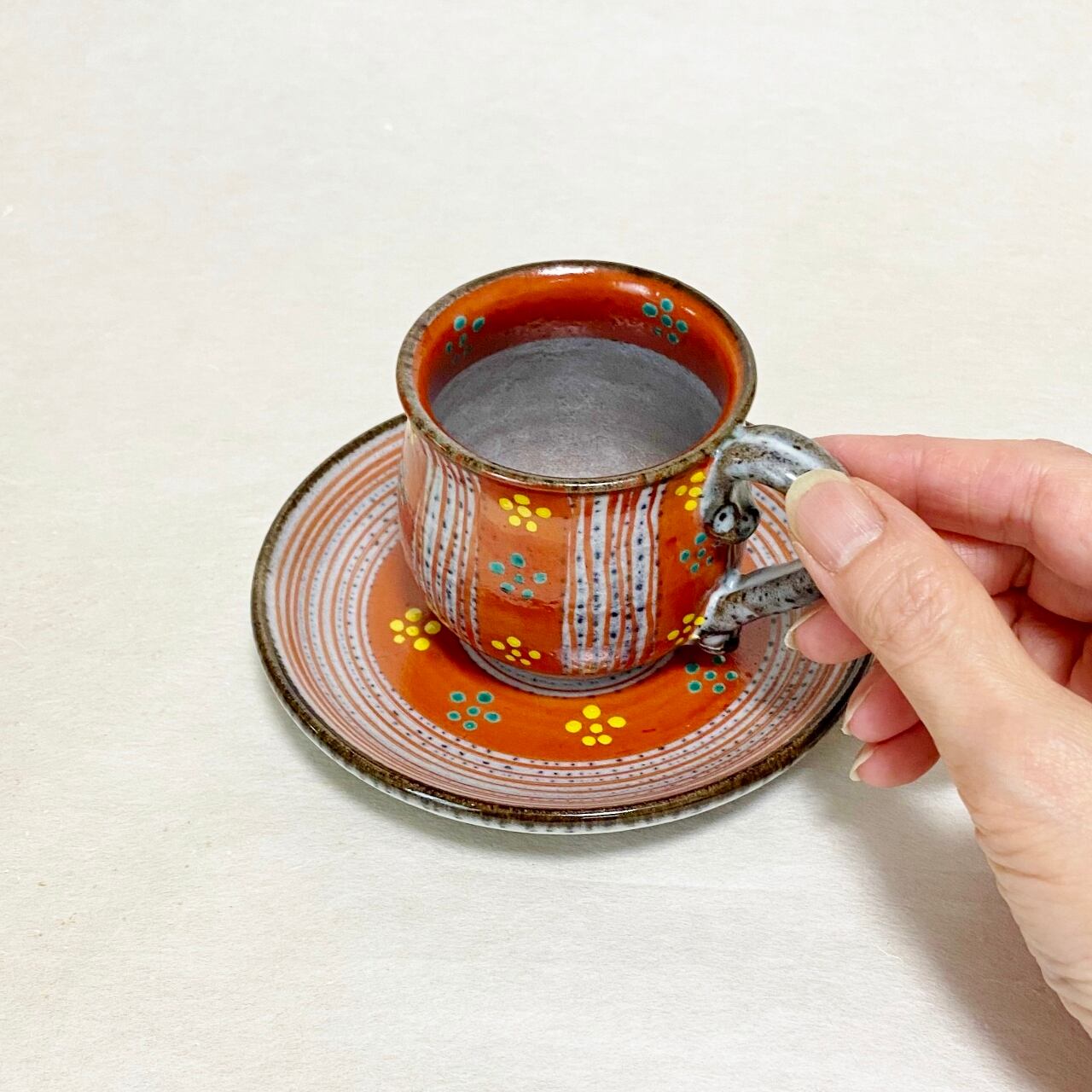 赫三郎窯の定番、ト草梅鉢紋のコーヒー碗皿です ころんとした丸みが可愛いカップと、お皿だけでも大活躍しそうなセット 同じシリーズの角型と、丸型のデザイン違いもございます