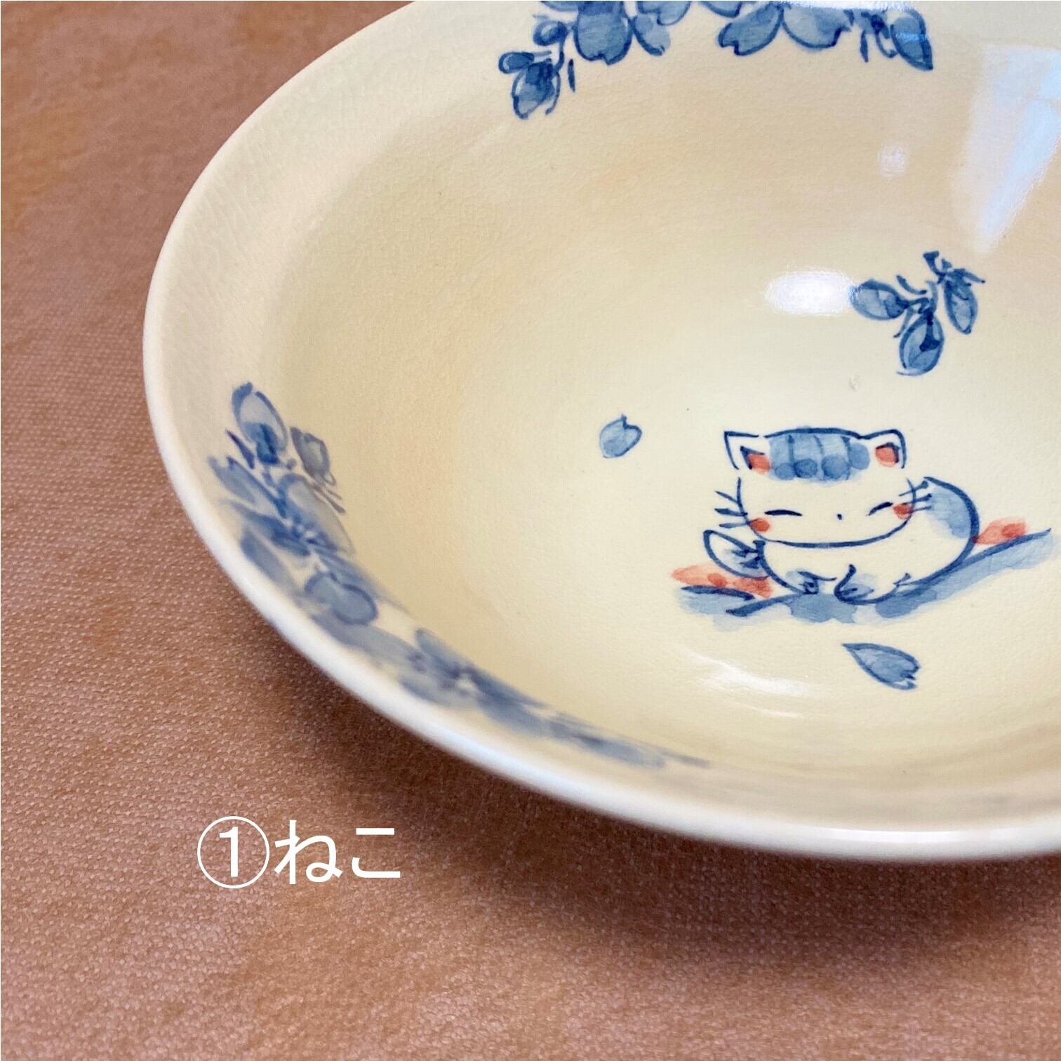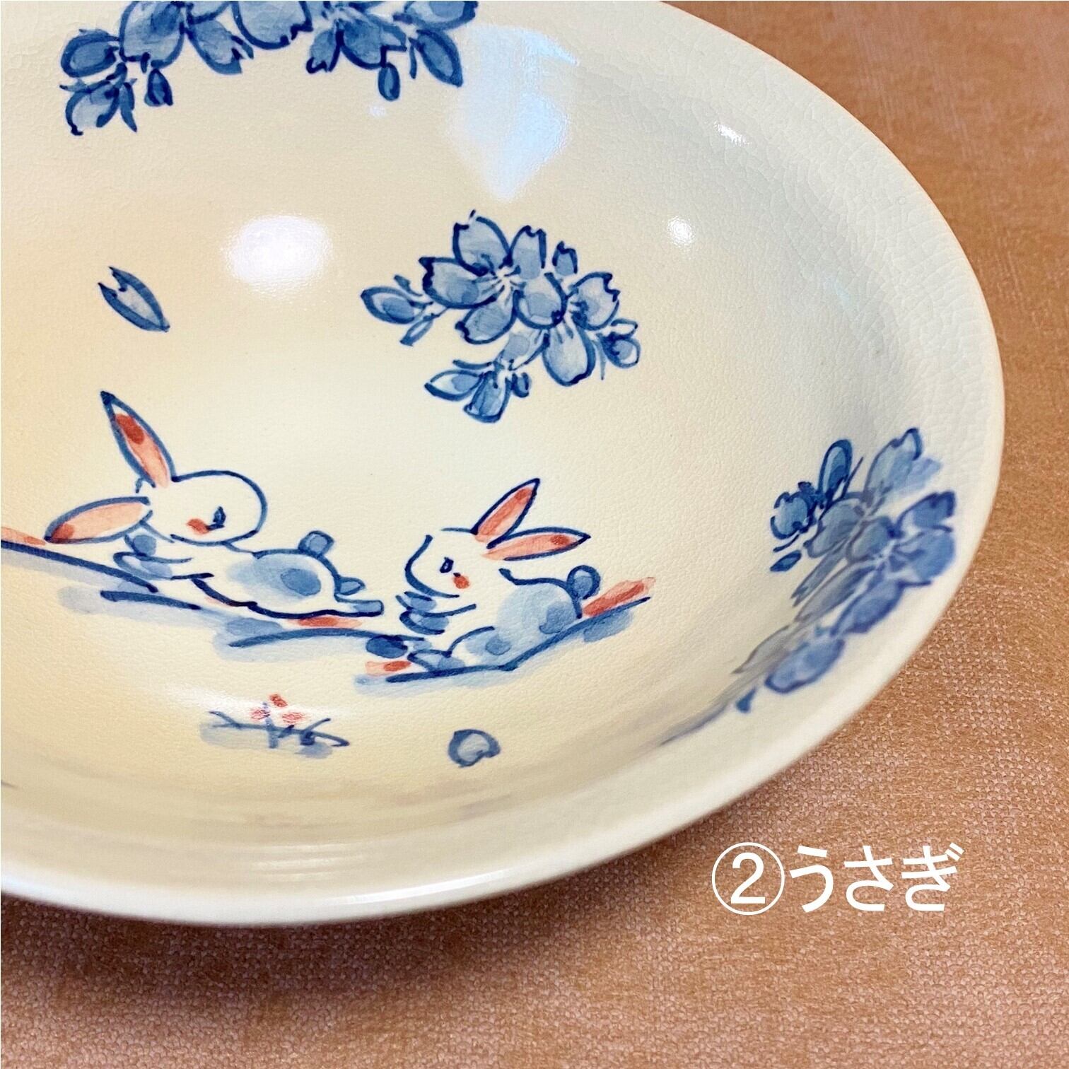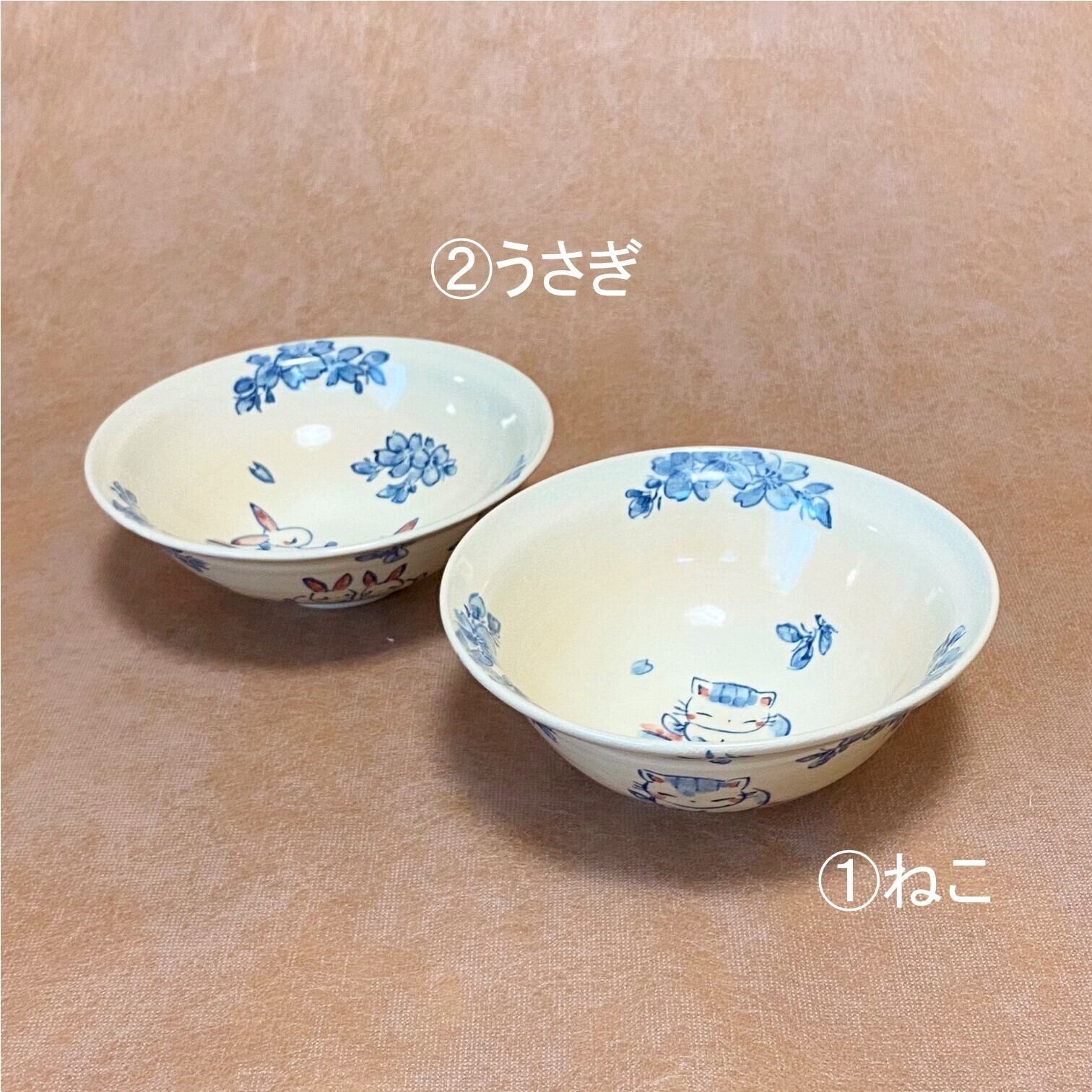 きめ細かい白土で仕上げられた器に、ねことうさぎの2種類の絵付け