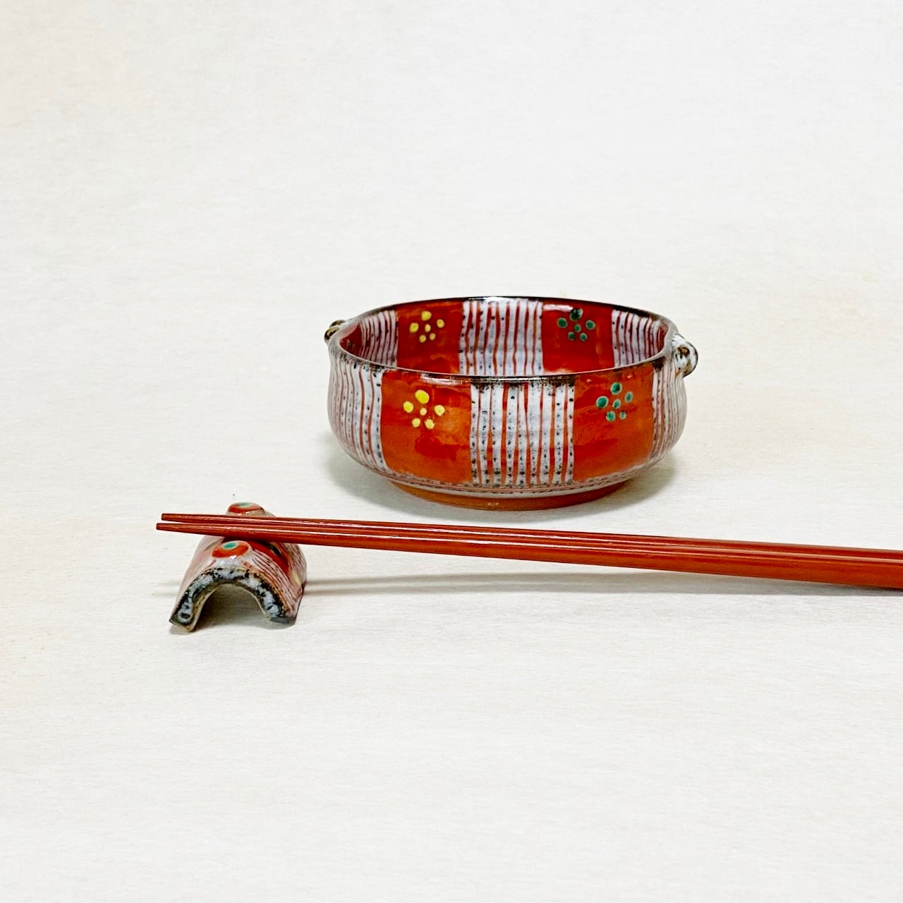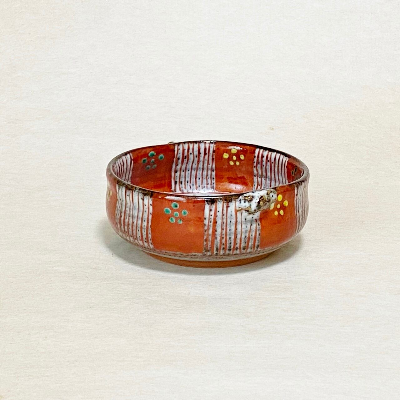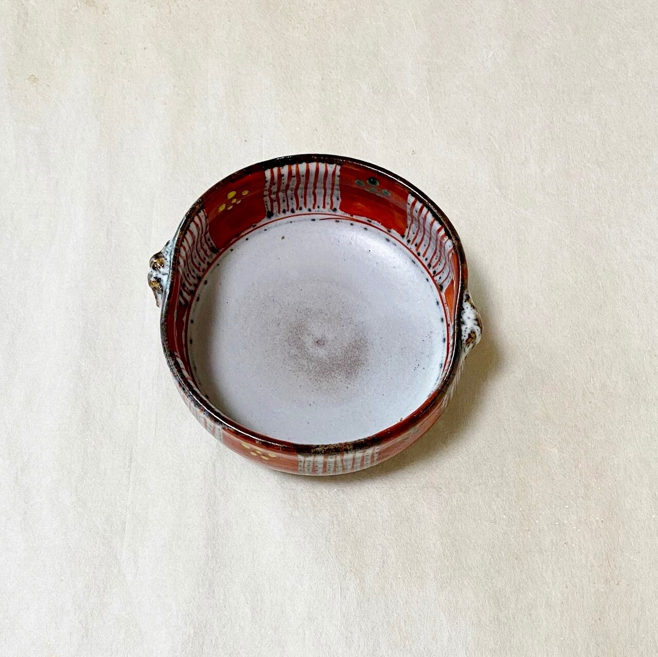<赫三郎窯>赤絵 ト草梅鉢紋 双耳多用鉢