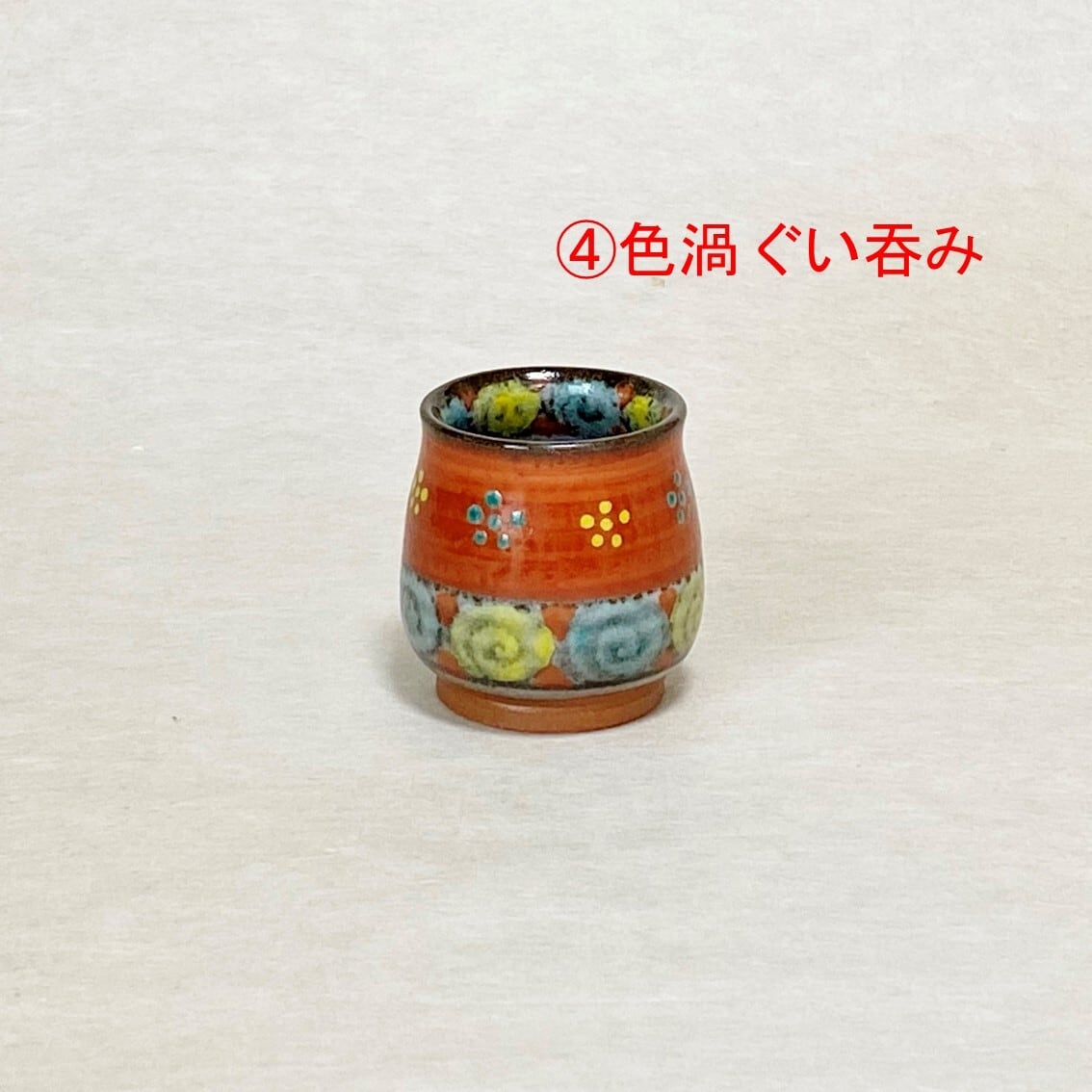 <④赤絵色渦梅鉢紋 ぐい吞み:直径約5cm×高さ約5.5cm>