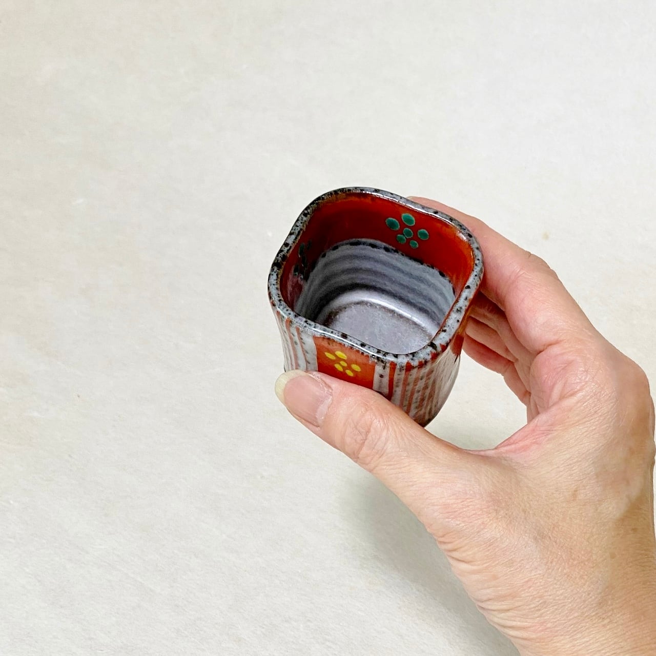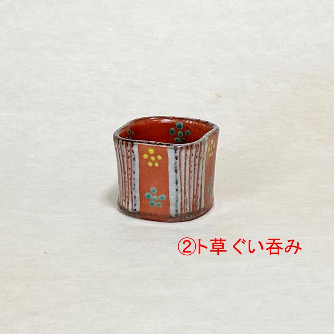 <②赤絵ト草梅鉢紋 ぐい吞み:約5.5cm×5.5cm×高さ約4.5cm>
